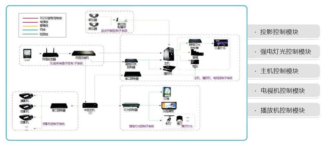 投影機(jī)控制模塊、強(qiáng)電燈光控制模塊、主機(jī)控制模塊、電視機(jī)控制模塊、播放機(jī)控制模塊等,